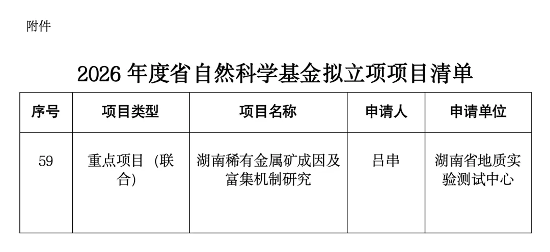 近日,2026年度湖南省自然科学基金项目立项结果正式公布。省测试中心吕串博士牵头申报的《湖南稀有金属矿成因及富集机制研究》项目,凭借扎实的研究基础、创新的技术路线和突出的应用价值,经过多轮严格评审成功立项,该项目类型为重点项目(联合)。这是我中心在省级重大基础研究项目申报上取得的重大突破!
