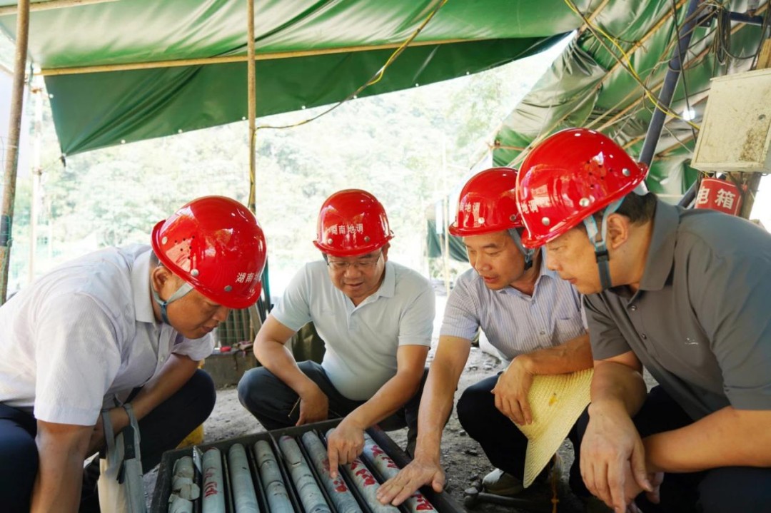 副书记周勇(左三)到湖南省郴州市北湖区白腊水矿区屋场坪锡矿深边部勘查项目慰问。