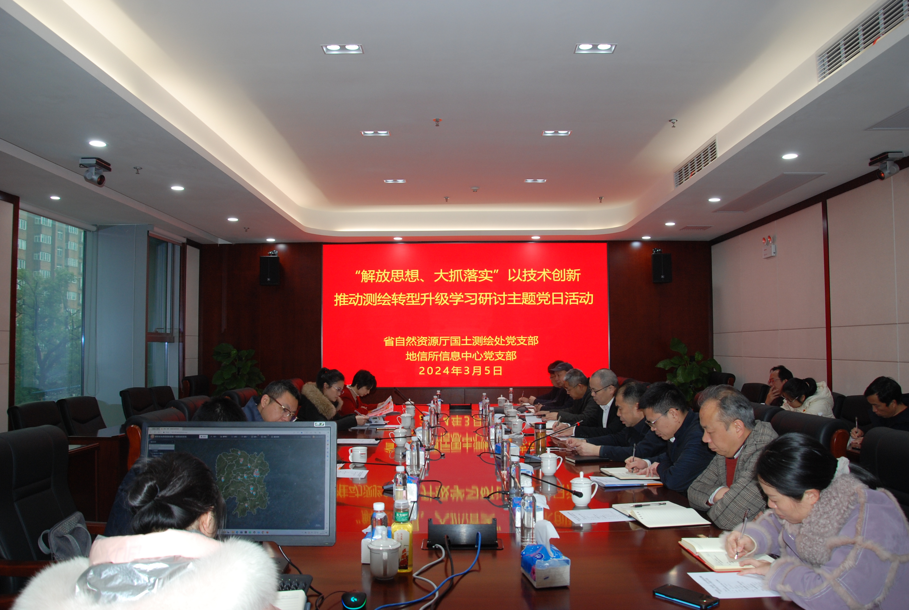 以高质量党建推动高质量发展。3月5日下午,嘉熙中心419会议室传出阵阵热烈的讨论声,省自然资源厅国土测绘处党支部和地信所信息中心党支部联合开展的“解放思想、大抓落实”以技术创新推动测绘转型升级学习研讨主题党日活动进入了高潮……