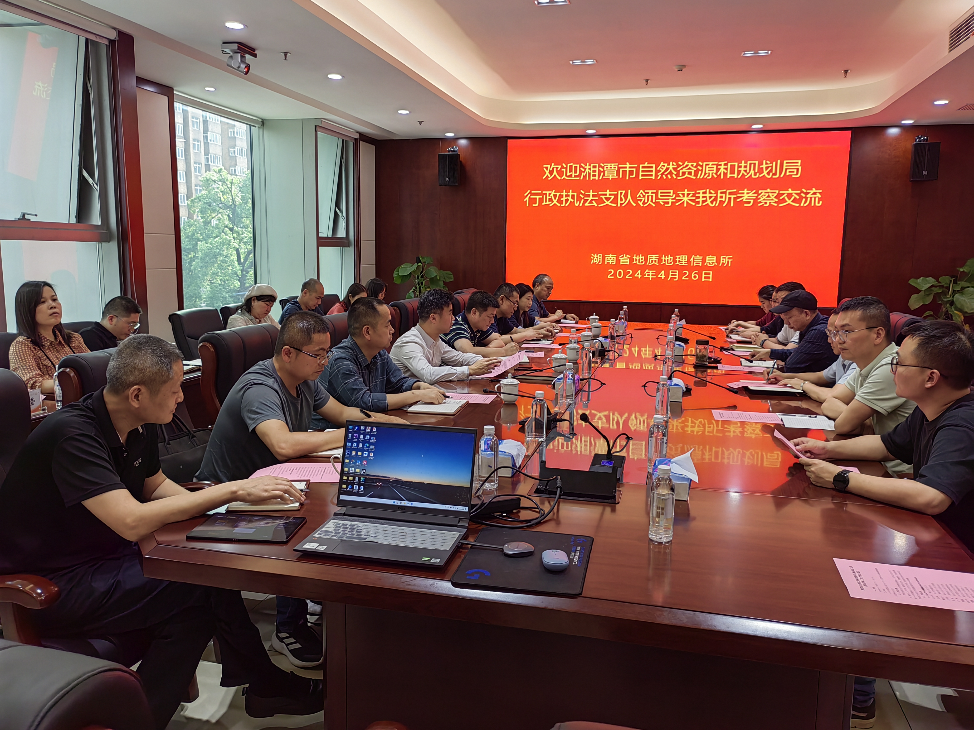 4月26日下午,湘潭市自然资源和规划局行政执法支队支队长赵凯峰、副支队长王玉坤一行16人来我所考察交流。副所长史与正、桂林分院、应急测绘中心负责人及相关技术人员参加座谈交流。