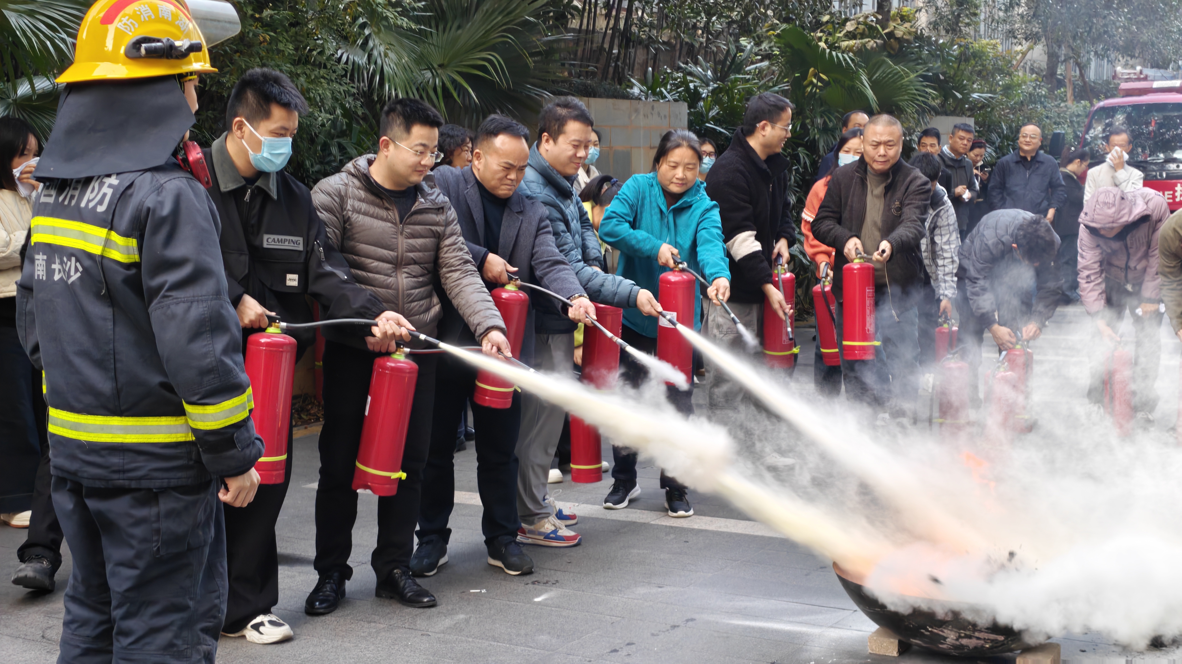 疏散演练后,定王台消防中队教官为全体人员带来了专业的实操教学。教官结合办公楼的火灾特点,重点讲解了消防栓、灭火器和防火面罩的正确使用方法,并强调了火灾初期的扑救要点与安全事项。在官兵的指导下,职工们踊跃上前,亲手操作灭火器对模拟火源进行扑灭,通过“理论+实践” 的深度结合,牢固掌握了消防器材的使用技能。