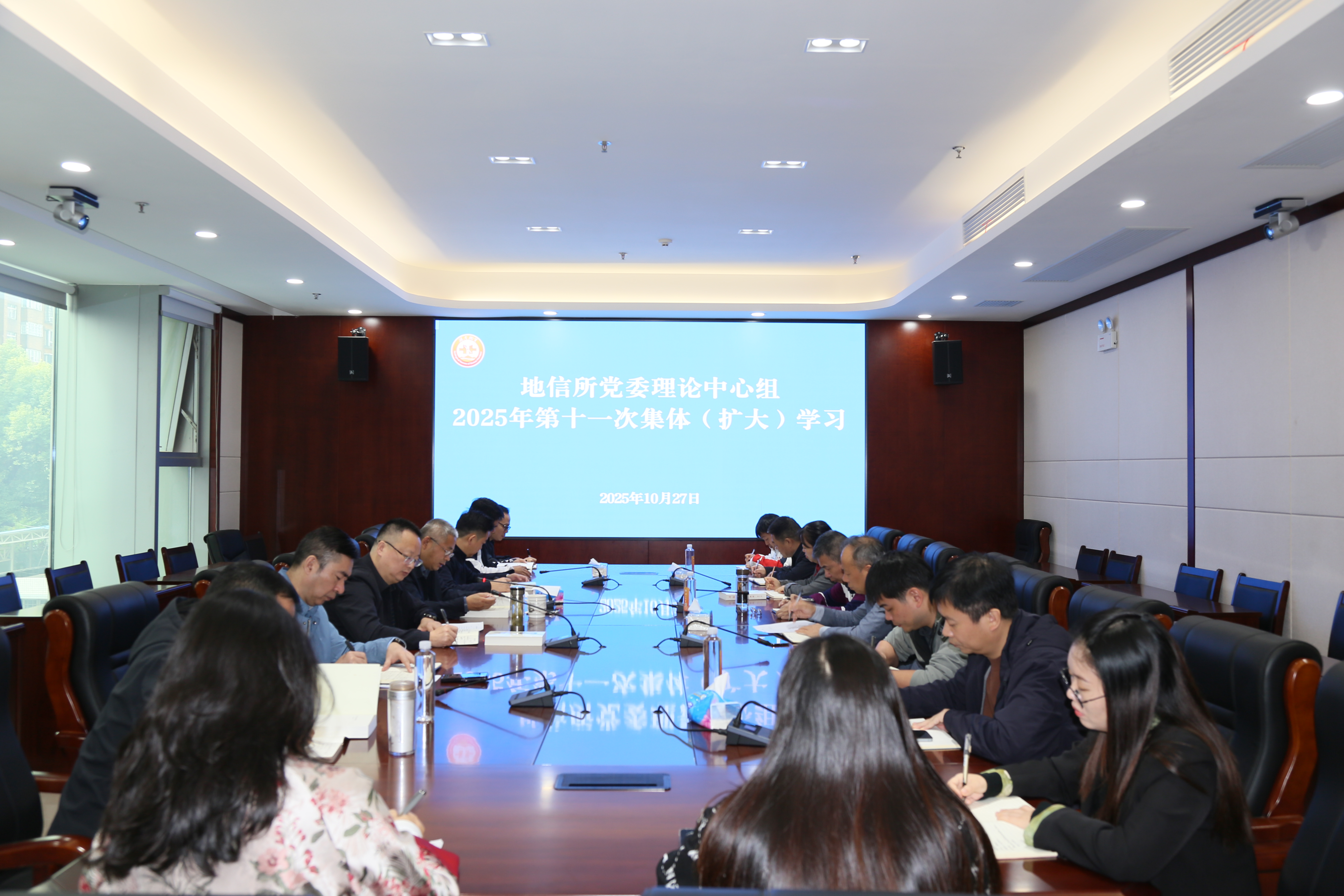 10月27日,地信所召开党委理论学习中心组2025年第11次集体(扩大)学习会议,深入学习贯彻《习近平谈治国理政》第五卷,传达学习党的二十届四中全会精神。党委书记耿磊主持学习,所长樊任武作总结讲话,所领导、机关部室负责人、在长实体负责人和各党支部书记参加学习。