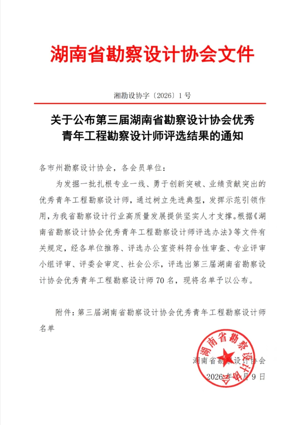 近日,湖南省勘察设计协会正式公布第三届“优秀青年工程勘察设计师”评选结果。澳门新葡京工矿所常宝同志凭借扎实的技术功底和丰富的工程实践经验,成功获评该荣誉称号。