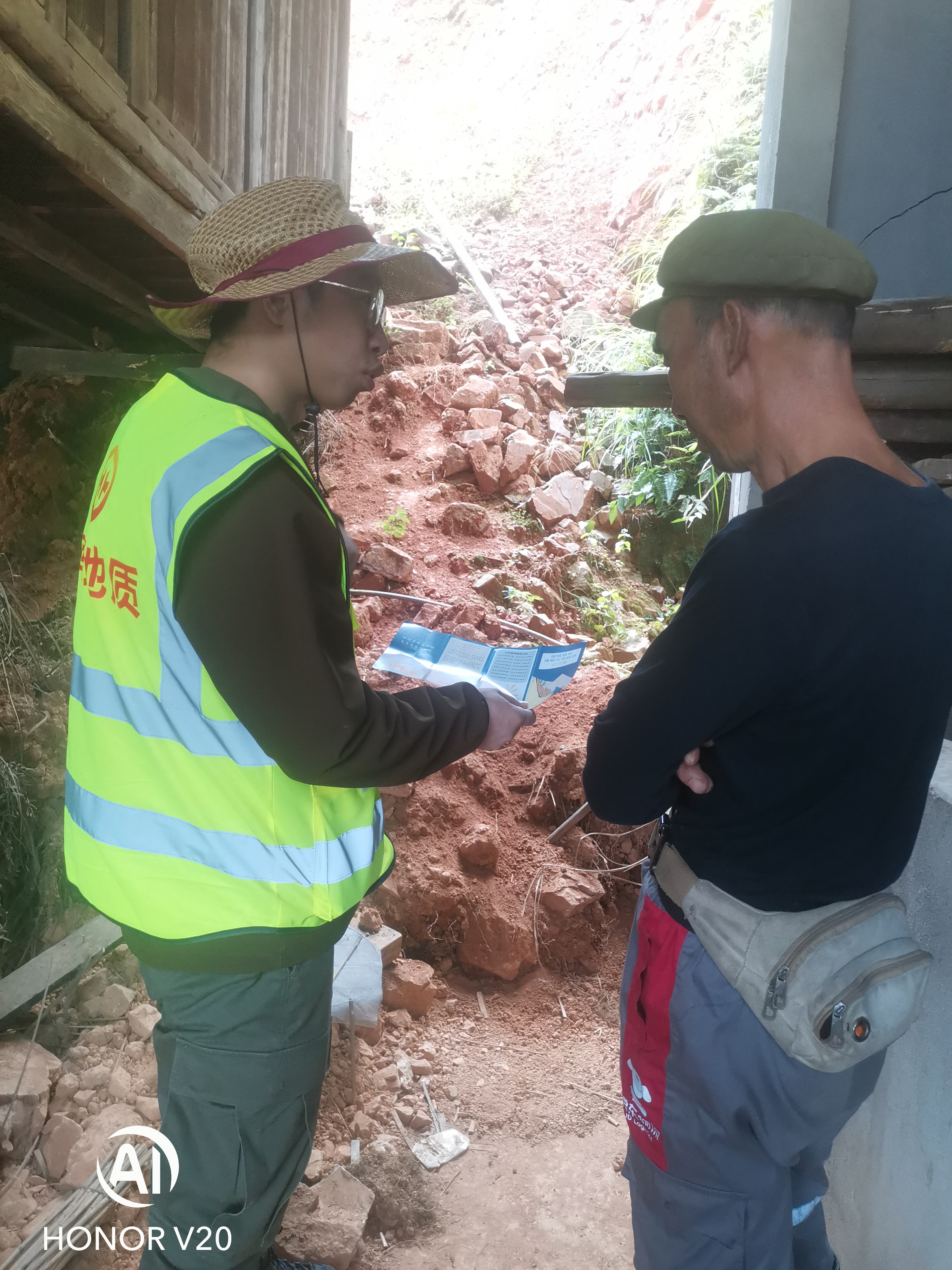 印象最深的是在黔城镇土溪口村的一斜坡单元,有一户人家的滑坡破坏程度到现在想起都让人心有余悸。其中后排房屋的主墙体基本倒塌,原滑坡土体在房屋内占据了1/3的面积,对户主一家的生活造成了极大的不便。我和颜伟裕在第一时间将房屋的灾害背景、情形等进行了详细了解,调查了滑坡的前、后缘及两侧的水工环地质等地质情况,记录了地灾特征、诱因及稳定性等地质特征,并对户主及家庭成员进行了登记。调查后,及时向户主及家人发放了“切坡建房地质灾害防治宣传册”,同时对滑坡特点、再次引发的诱因等进行了具体讲解,对降低灾害风险提出了修筑简单排水工程、避免坡体漫灌的建议,并提醒户主要及时关注天气,定期巡查坡体,提前做好预警等,及时避免了一场可能发生的地质灾害,得到了当地村民的高度赞扬。