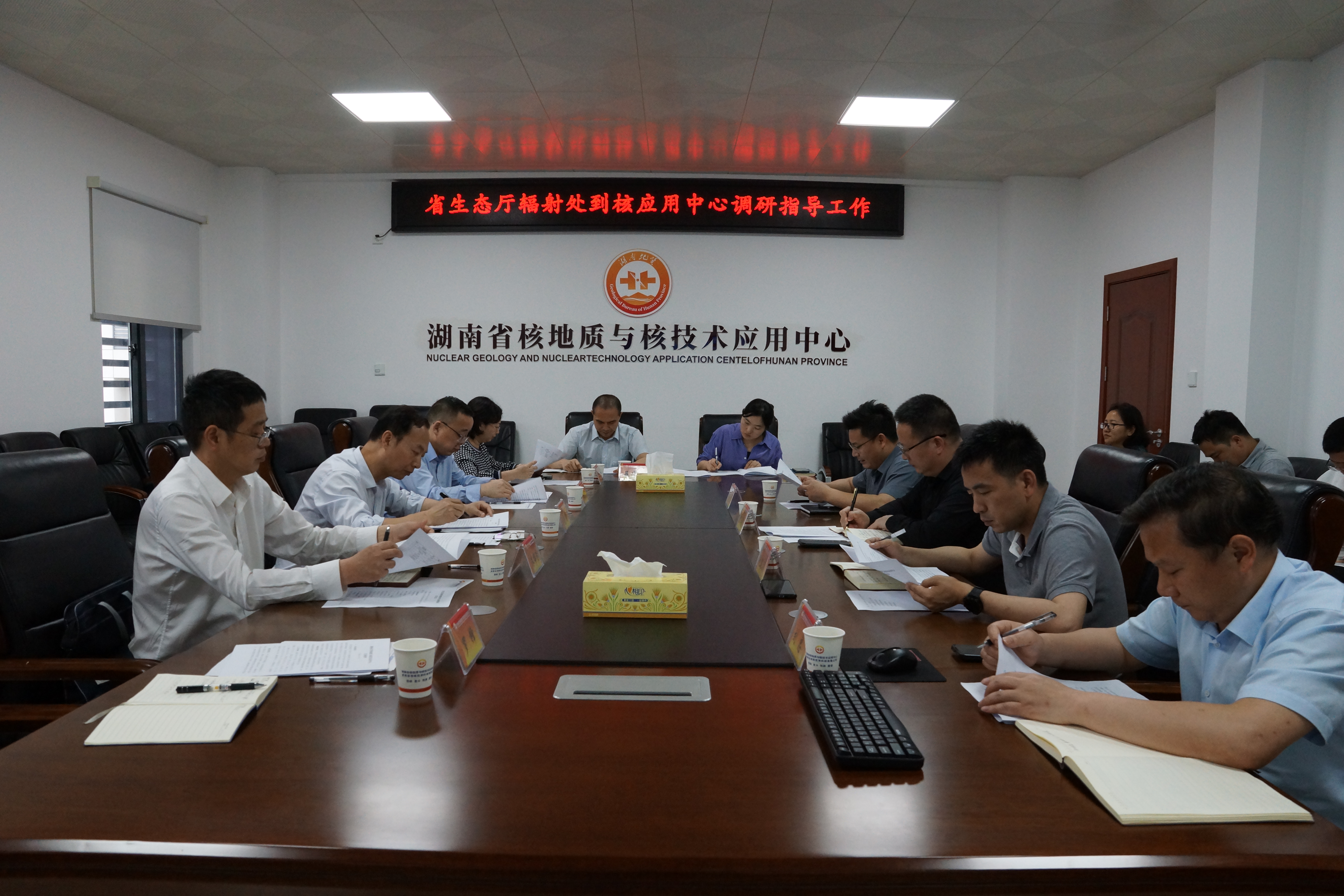 樊任武对刘剑一行的到来表示热烈欢迎,衷心感谢省生态环境厅对中心一直以来的关心和支持,并表示中心将朝着服务更细、业务更精、能力更强、品牌更亮的目标发展,更好助力湖南生态文明建设。赵胤淳感谢辐射处到中心调研指导工作,希望省生态厅在中心相关工作人员跟班学习、党建工作交流等方面给予支持与合作。