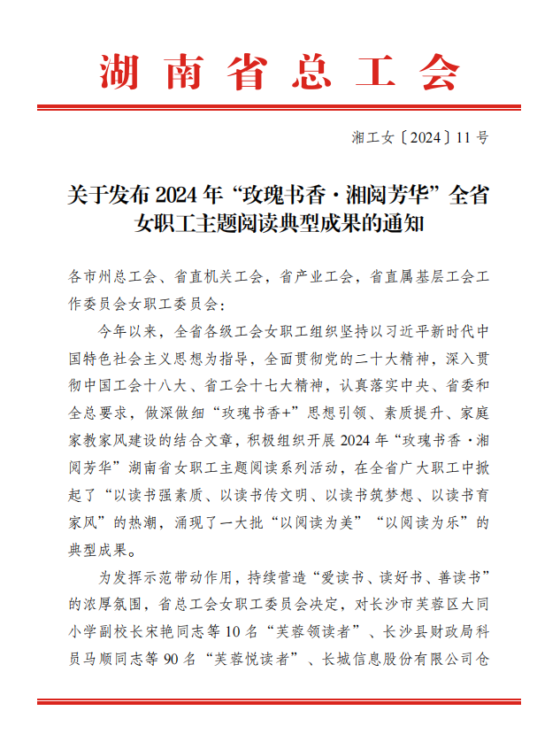 日前,湖南省总工会发布了2024年“玫瑰书香·湘阅芳华”全省女职工主题阅读典型成果,省空间所王莉雯荣获“芙蓉悦读者”称号,谭欣家庭荣获“玫瑰书香家庭”称号,刘程慧、衷瑶荣获“好家风·好传承”主题征文优秀奖。 此次活动由湖南省总工会女职工委员会举办,共发布10名...