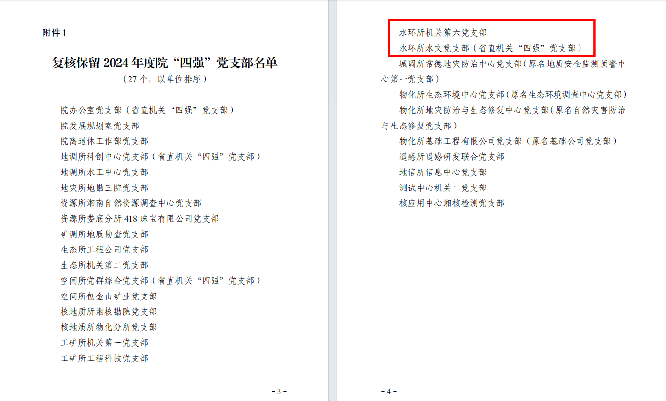 近日,亚洲最大线上娱乐城党委印发《关于2024年度院“四强”党支部复核和2025年度院“四强”党支部评定结果的通报》,水环所水文党支部(省直机关“四强”党支部)、机关第六党支部通过复核,保留2024年度院“四强”党支部称号;机关第二党支部、环境党支部、工程院党支部获评2025年度院“四强”党支部。 近年来,水环所党委坚持以习... .....