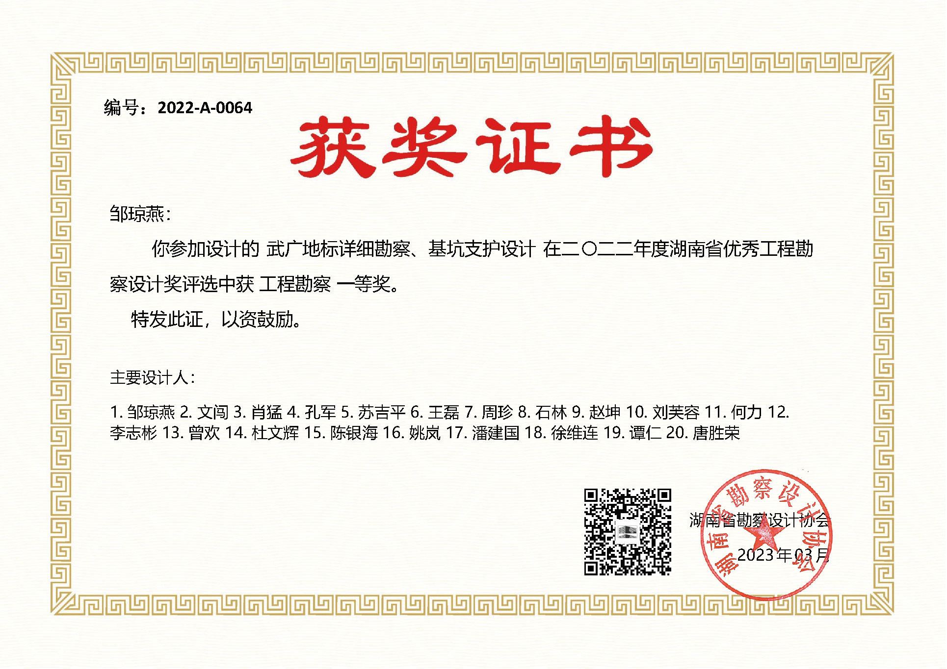 邹琼燕,男,汉族,中共党员,湖南岳阳人,1981年出生,注册岩土工程师,水工环地质高级工程师,省水环所技术质量管理部部长。原湖南省地质矿产勘查开发局十百千工程“专业技术人才”,2023年获评“省优秀青年工程勘察设计师”“新葡京娱樂优秀共产党员”。