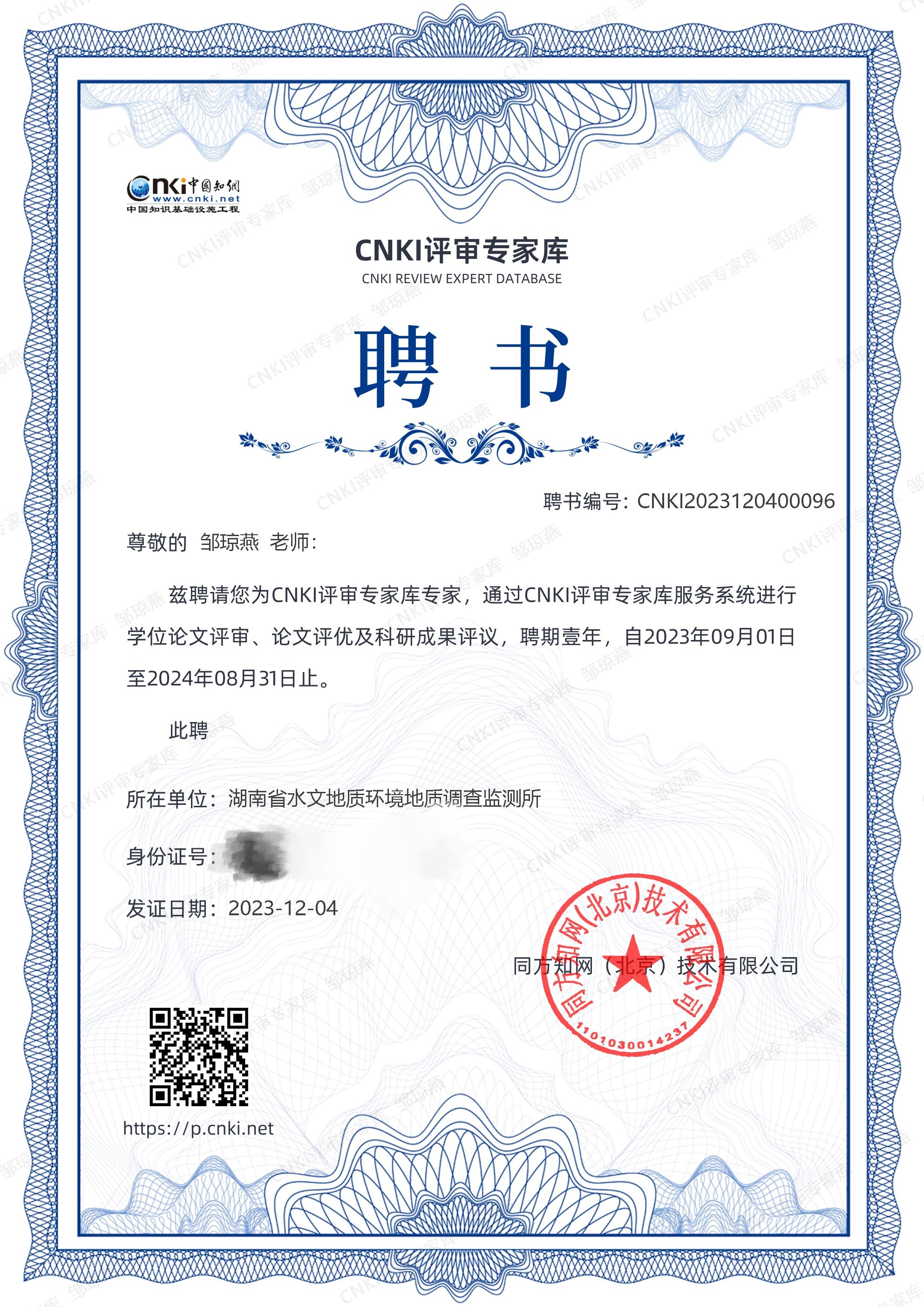 邹琼燕被中国知网聘请为“CNKI评审专家库”专家