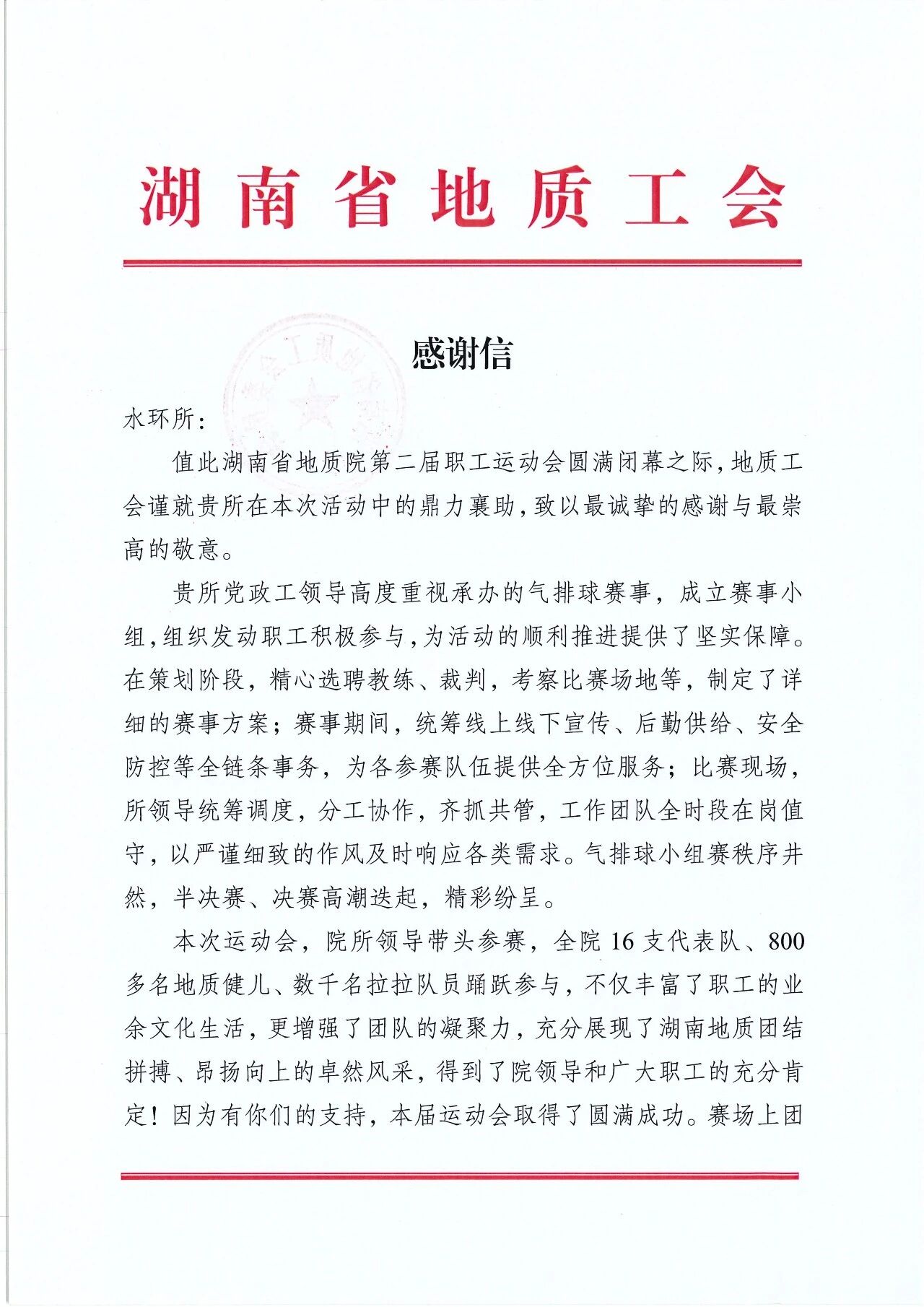 新葡京娱樂水环所收到地质工会的感谢信