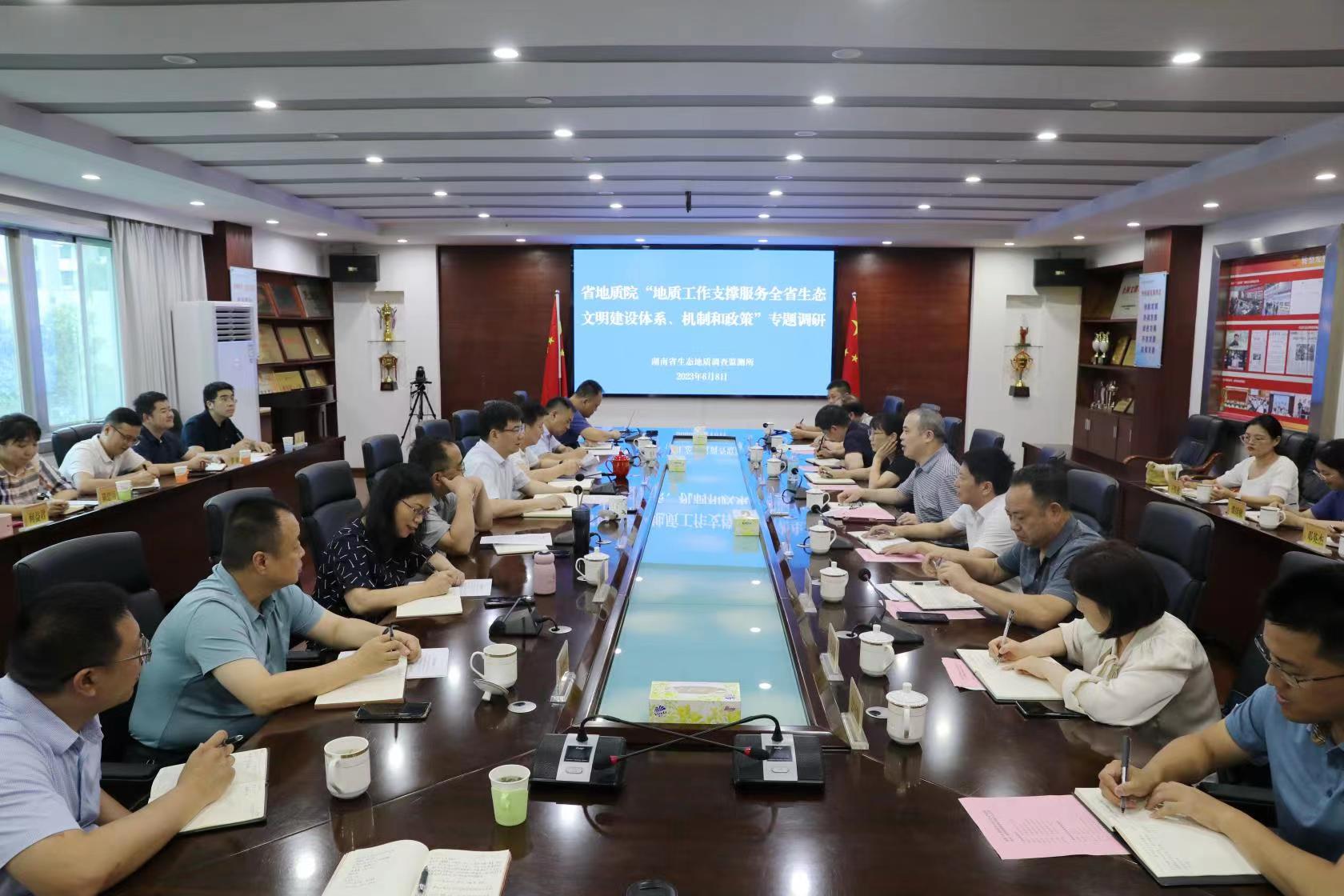 调研组听取了生态所在关于服务全省生态文明建设方面的基本情况、参与生态文明建设体制机制运行情况、取得主要成果、存在的问题和建议四个方面的汇报,对生态所在矿山生态修复、国土空间规划、土壤污染调查与治理、黑臭水体综合整治、地质灾害防治等方面的工作给予了高度肯定。同时,就生态文明建设方面的人才队伍建设、转型发展、地质双碳、科研创新等方面进行了深入探讨。