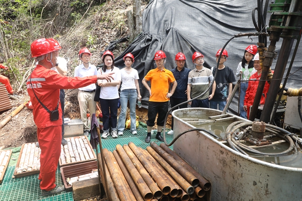 随后,大家来到省生态所汝城县集益乡谭集玻璃用脉石英矿勘查项目钻探现场,刘见和向富生代表省财政厅慰问了坚守在地勘项目一线的困难职工。钻探机台位于山林深部,大家戴上安全帽,走过狭长的水渠,踩过泥泞山路,穿过茂密的山林才到达一线机台工地。专技人员现场介绍了项目情况,交流了生产生活状况,并现场演示了地质钻探施工操作。大家对钻机钻孔、进尺、取芯、编录等实际操作于新奇中新增了对地质技术人员跋山涉水、风餐露宿、战天斗地为祖国寻找宝藏的职业敬意。