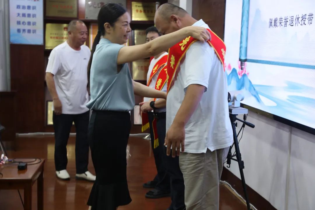 所领导为光荣退休的同志佩戴荣誉绶带,青年职工代表献上鲜花,由衷感谢老同志们多年来为生态地质事业付出的艰辛努力和无私奉献。退休同志在感言中流露出对单位的深厚感情,并寄语年轻一代继续奋发向前。