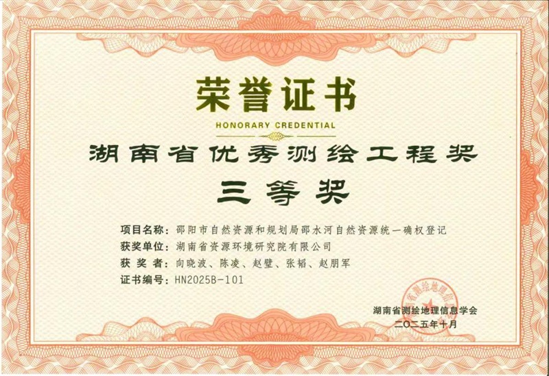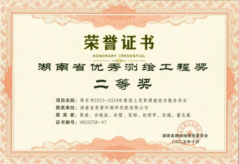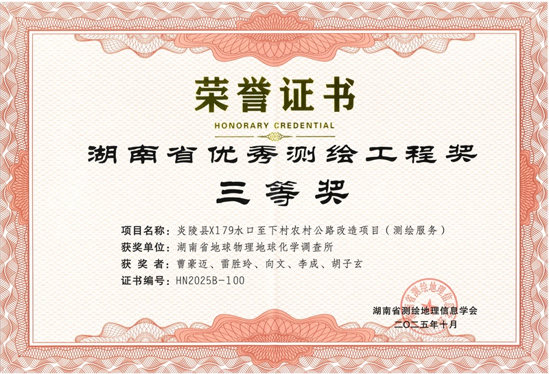 近日,2025年湖南省优秀测绘工程奖评选结果揭晓,新葡京娱樂物化所多个项目脱颖而出,荣获一项二等奖、两项三等奖。其中,测绘地理信息中心承担的“邵东市2023-2024年度国土变更调查技术服务项目”获评二等奖;该中心另一项目“邵阳市自然资源和规划局邵水河自然资源统一确权登记项目”,以及国土空间规划与土地利用中心承担的“炎陵X179水口至下村农村公路改造项目(测绘服务)”双双荣获三等奖。