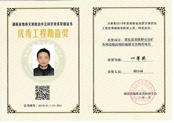 胡小林紧盯前沿技术,主持了一批技术难题攻关,并大力推广新技术新方法应用,将井中CT工程物探方法、多点深部位移监测方法分别应用在邵阳浅层煤采空区勘查、石膏采空区变形监测等项目上并取得良好成效,主持的项目获得湖南省优秀工程勘查一等奖、三等奖等。助力湖南生态文明建设,组织部门技术团队加班加点编制国家首批历史遗留废弃矿山生态修复示范工程申报材料,最终成功申报了邵怀废弃矿山生态修复项目,为邵阳、怀化两市争取中央财政资金3亿元。