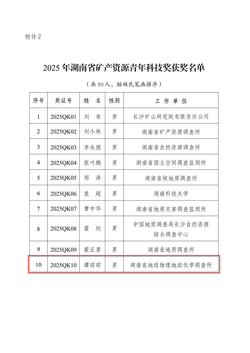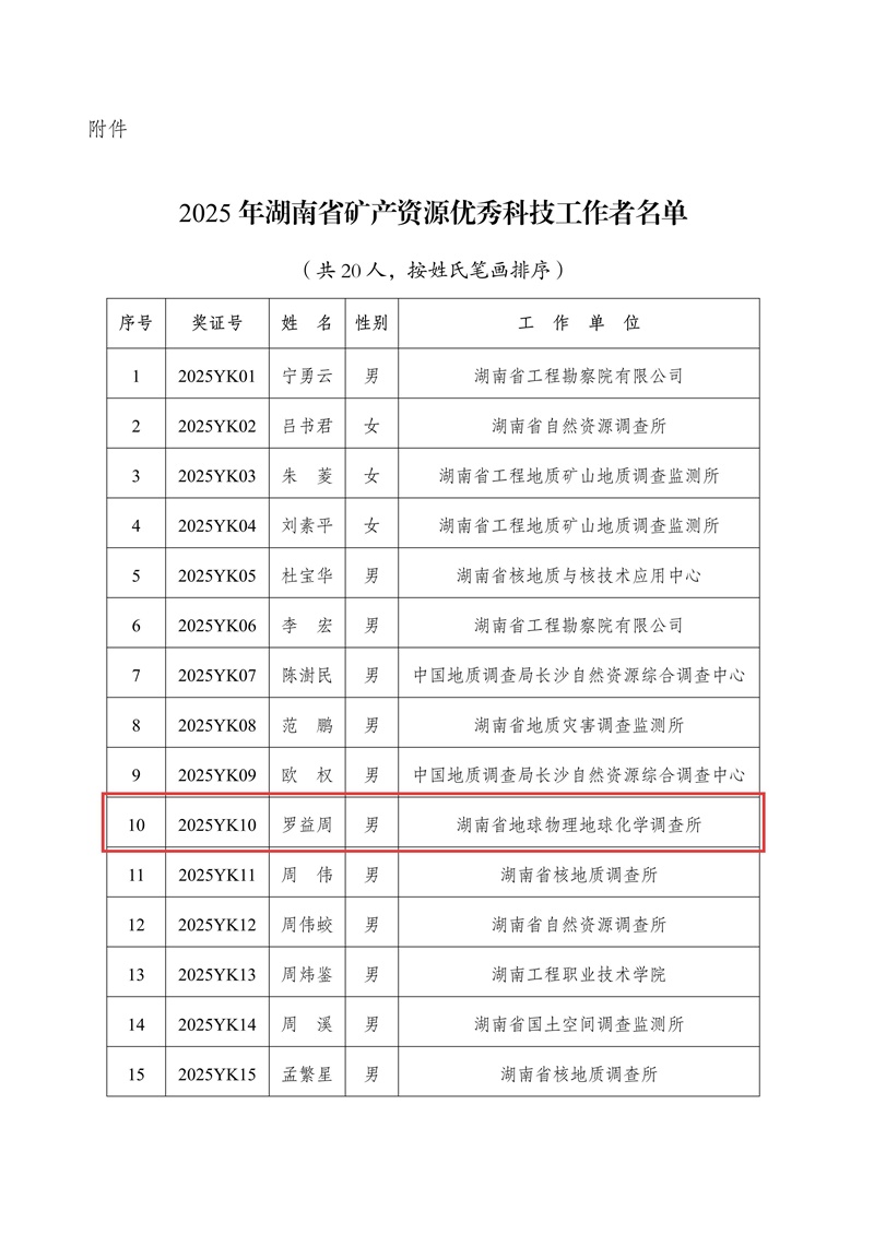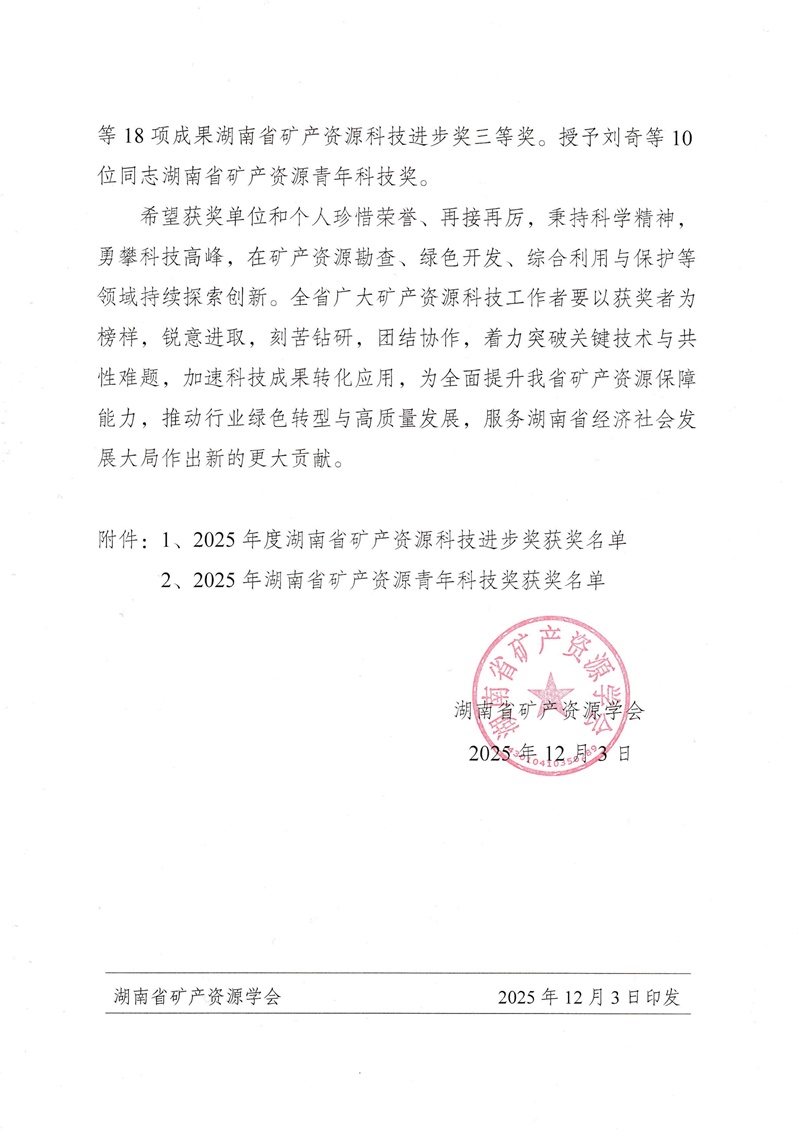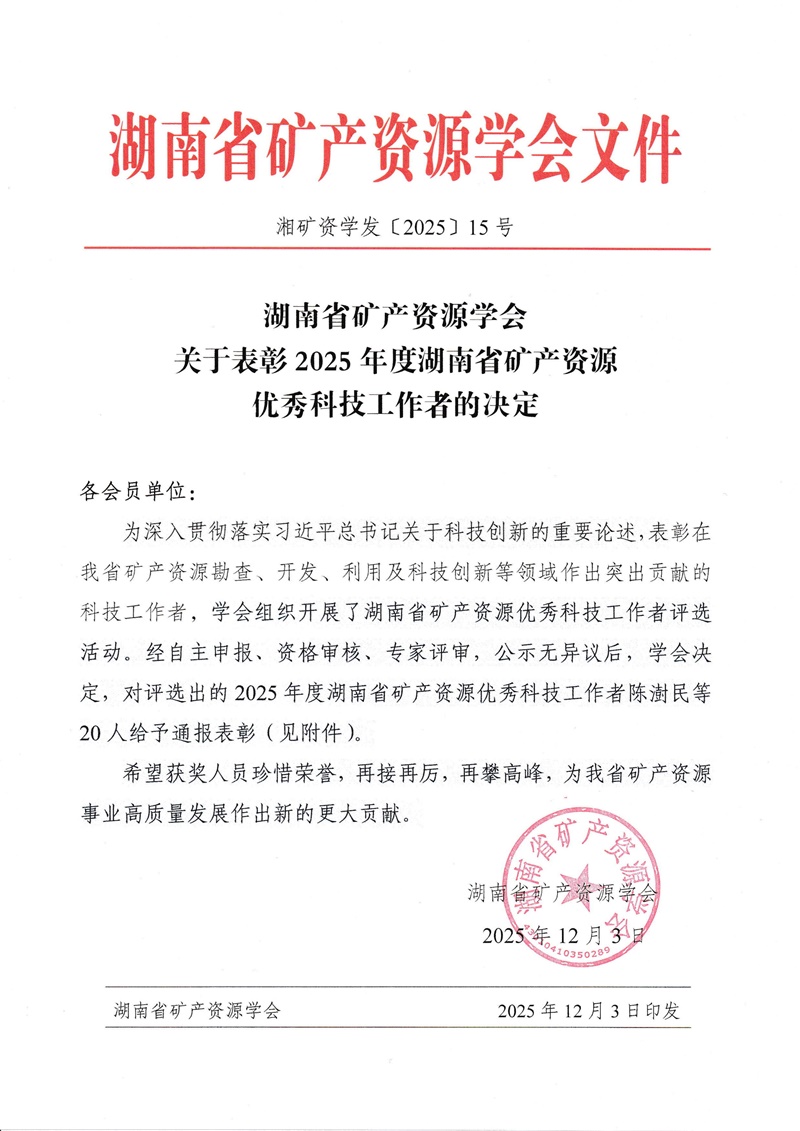 在近日揭晓的湖南省矿产资源学会2025年度科学技术奖及优秀个人评选结果中,新葡京娱樂物化所共有四个项目、三位科技工作者获表彰。其中,“湖南祁零盆地锰矿找矿突破”项目获科学技术奖一等奖,“中建材投资南方石墨矿区深部隐伏构造验证工程”获二等奖,“湖南省永州市零陵区东湘桥矿段锰矿详查”和“复杂地质条件区大口径深井钻探施工体系与应用”项目同获三等奖。廖凤初、罗益周获评“优秀科技工作者”,谭昭昭获评“青年科技工作者”。