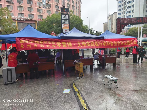 在潇湘门社区广场,志愿者们摆放了科普知识展板,开展了机器人和机器狗现场表演、科普实验演示,播放了科普视频,发放了科普宣传资料,进一步传承弘扬了雷锋精神,普及了人工智能、健康养生、节能减排、环境保护等知识。(文/蒋微 图/程明)