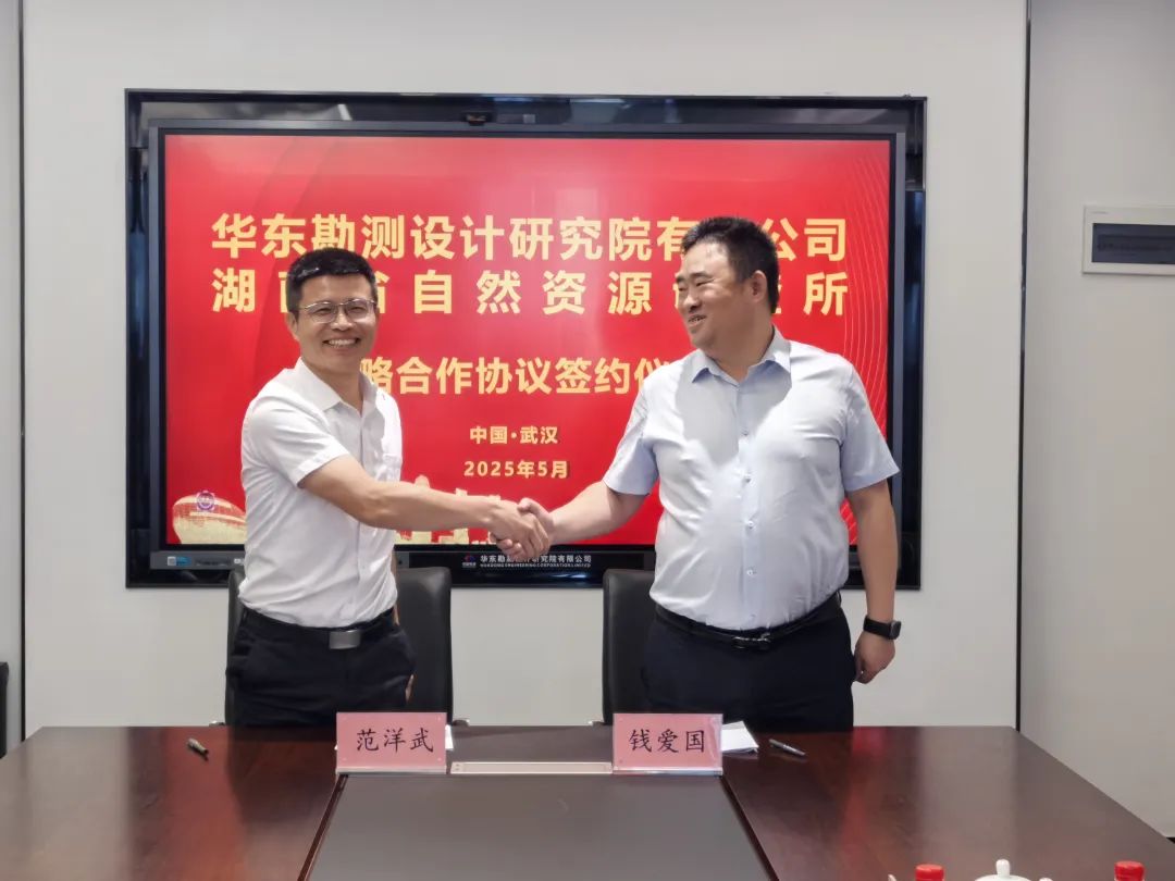 5月29日,湖南省自然资源调查所与中国电建集团华东勘测设计研究院有限公司(以下简称“华东院”)华中区域总部战略合作协议签订仪式在湖北省武汉市举行,党委书记范洋武、华东院华中区域总部总经理钱爱国代表双方签约。副所长刘茂强、华东院华中区域总部副总经理陈宏辉参加。