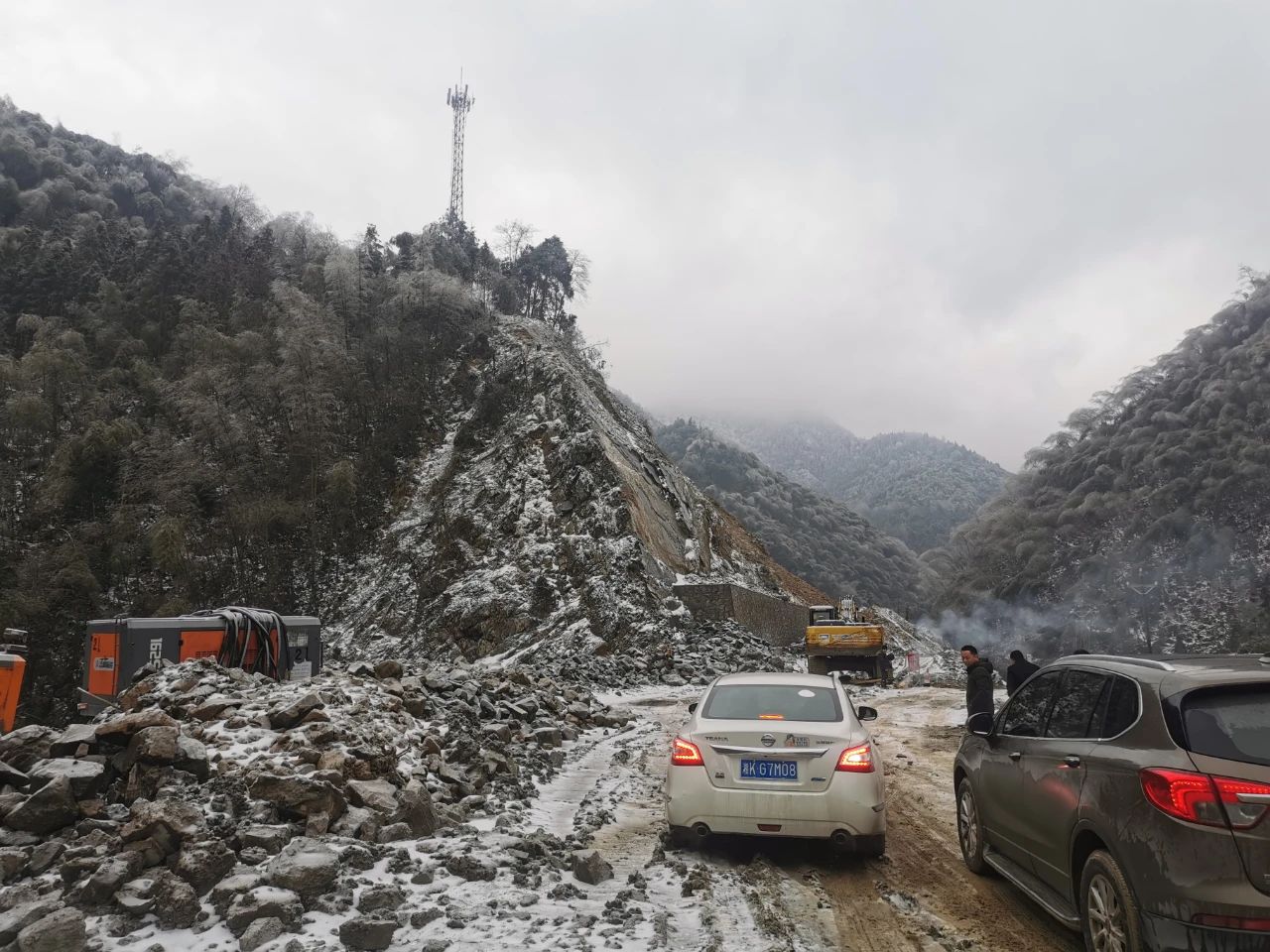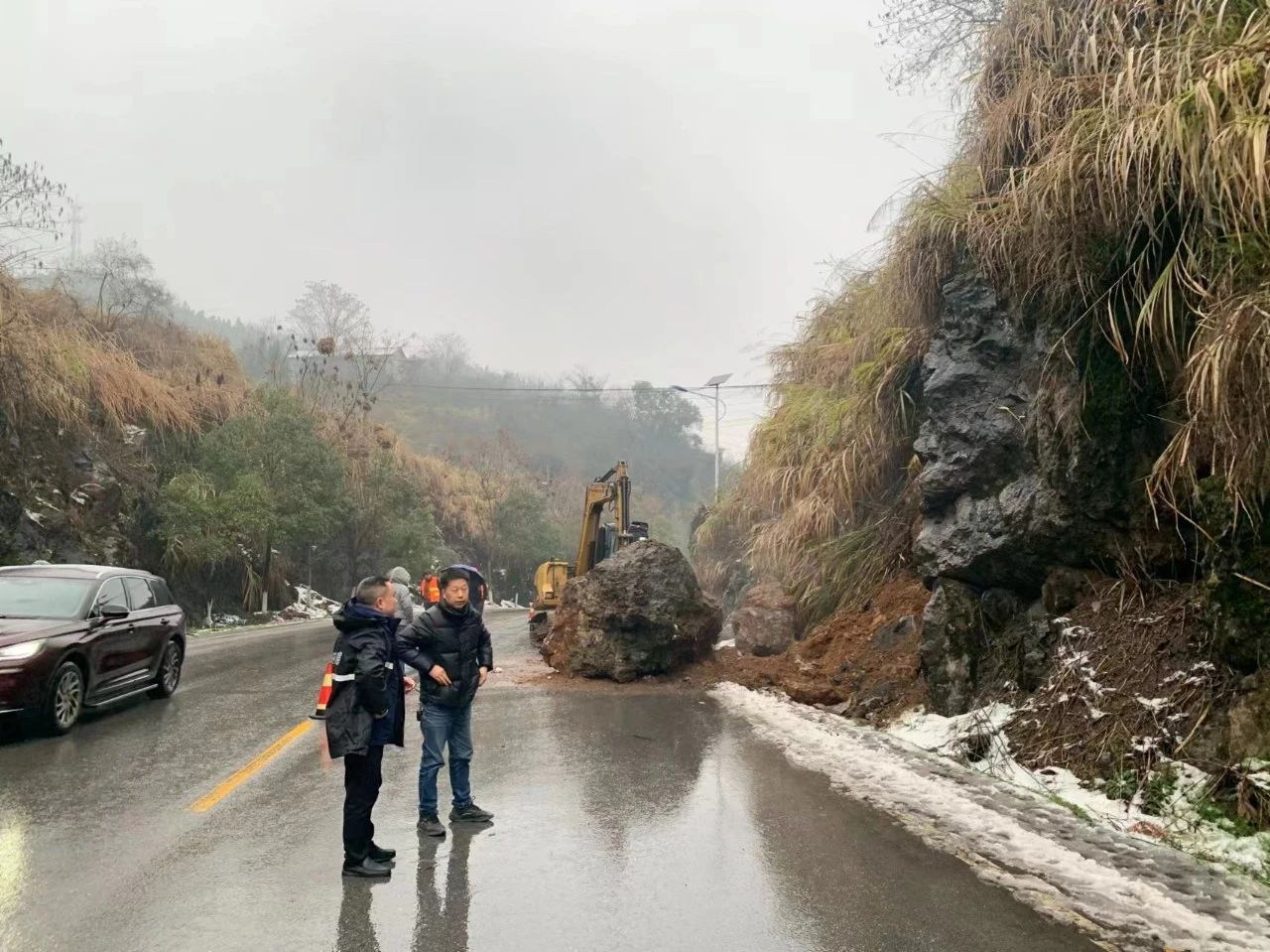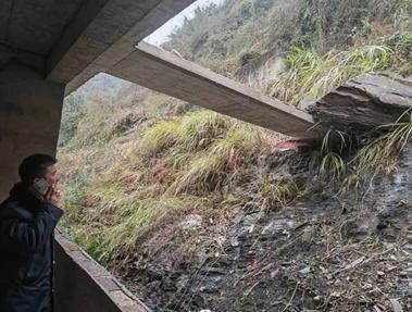 2月5日(腊月二十六)正午时分,怀化市中方县花桥镇S250省道后溪段北侧边坡发生了滚石崩塌,一块重达2吨多的巨石滚落至道路一侧,所幸未造成人员伤亡和车辆损毁。接到险情通知,地灾中心立即派出值班技术人员陈林冒着雨雪赶赴现场处置灾情,并提出了专业化的处置建议。