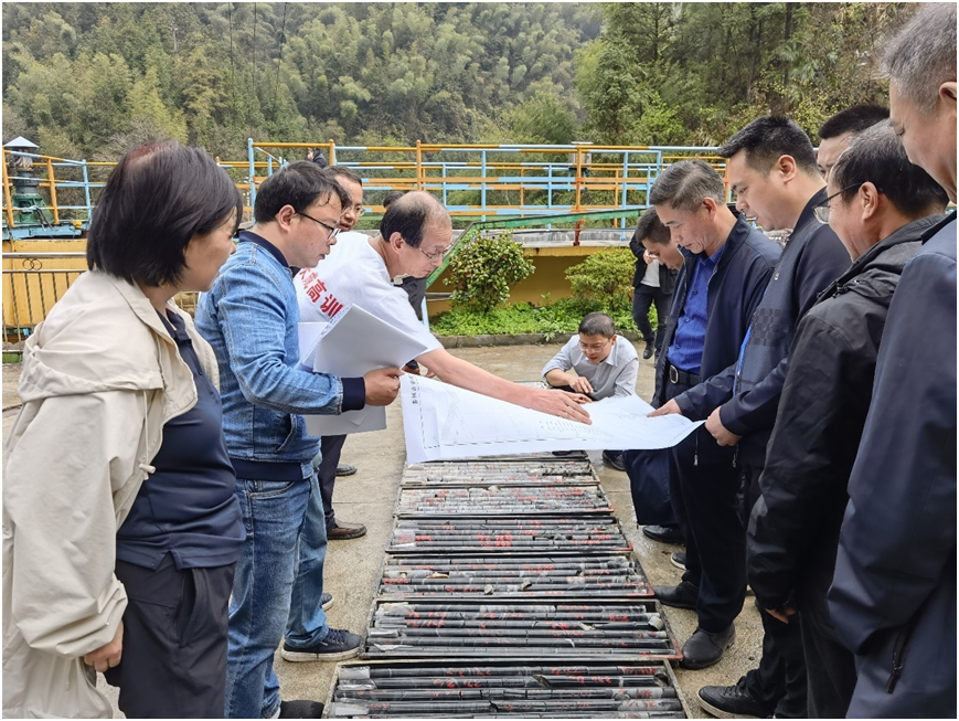 在项目现场,督导组一行听取了项目负责人关于项目任务情况、工作进展、主要地质成果、存在问题及下步工作计划的汇报,逐箱逐块仔细察看了钻孔岩心,认真细致地检查了项目原始资料、阶段性成果资料,对项目把脉问诊。督导组一致认为项目施工进度正常,质量过硬,建议加快进度、加强研究、早出成果,优质完成项目任务,并就如何优化工作思路、如何升华找矿成果及项目的不足和注意事项提出了详细的指导意见;尤其是“湖南省隆回县杏枫山矿区边部金矿普查”项目施工的千米深孔取得了喜人的见矿效果,对湖南“金腰带”地区深部找矿具有重要的指导意义,项目组应抓紧时间采样测试,更加严谨细致地编录好钻孔岩心,要深入矿山坑道仔细观察,将浅部坑道与深部钻孔所揭露的岩层、破碎带、矿脉带的产状、岩性组合、蚀变及矿化特征等进行对比,收集周边矿山地质资料及区域物化探资料,集中精干力量加强综合研究和科研跟进,争取出好成果、出大成果。