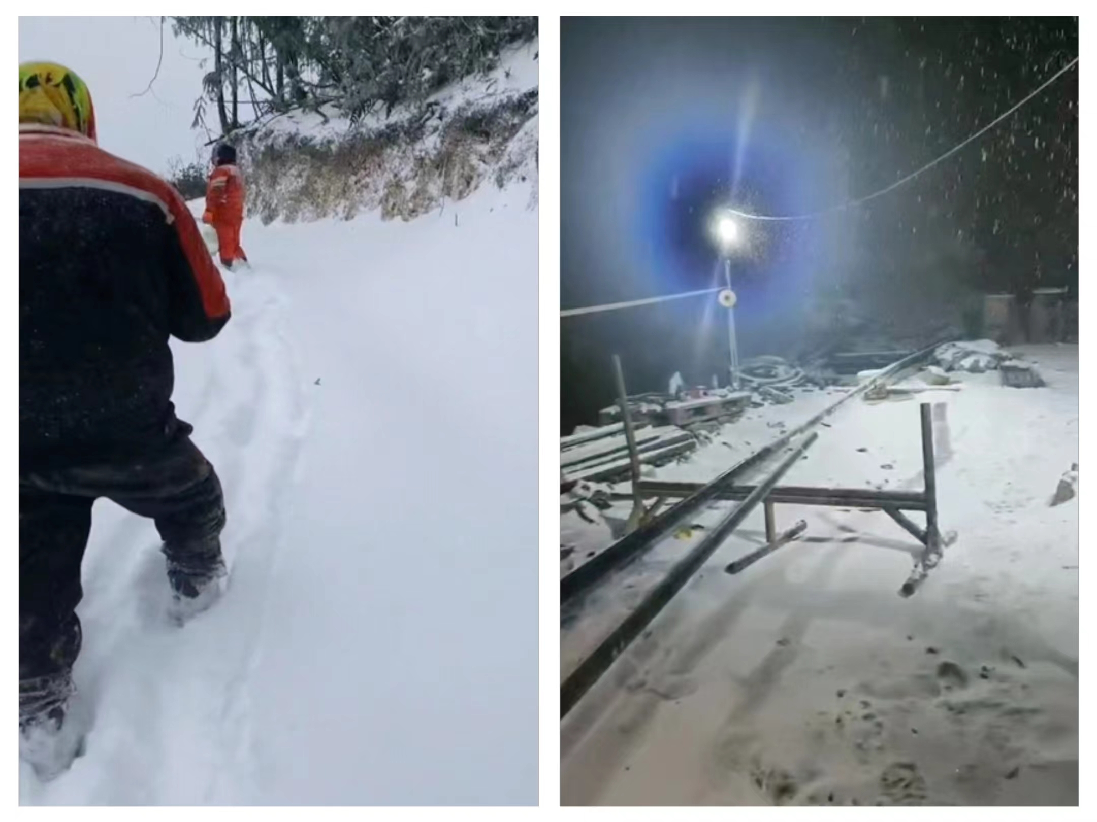 施工过程中,部分村民无理阻工,多次封锁施工道路,导致钻机反复停工,孔内隐患加剧。此时正值极端雨雪冰冻天气,现场最低气温降至零下10℃,机台积雪最厚达40cm,水管、柴油机被冻结。机台安排专人全天不时敲击水管,抽水机保持二十四小时运转,以保证施工用水。大雪封路,项目负责人朱贤组织人员肩挑背扛,将原材料及钻机易耗件搬运至施工现场。工作人员发扬勇于拼博、善于斗争的精神,与天斗、与地斗,全力推进施工进度。
