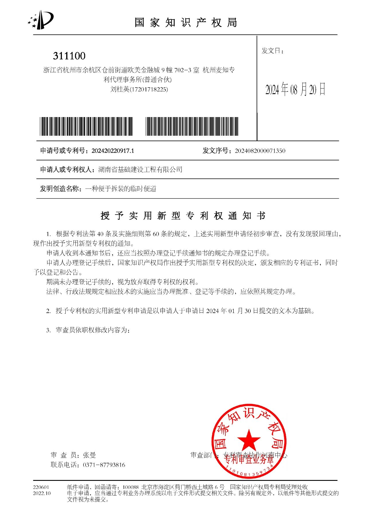8月20日,资源所下属全资企业湖南省基础建设工程有限公司收到国家知识产权局发来的《授予实用新型专利通知书》,明确由该公司发明的“一种便于拆装的临时便道”获审查通过,被授予实用新型专利权。