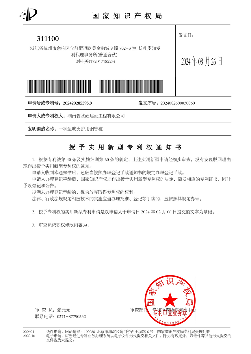 该专利名为“一种边坡支护用钢管桩”,专利号为 202420285595.9。该实用新型专利通过在管内壁刷涂硅烷基纳米涂层,可以有效防止水泥混凝土腐蚀和渗透铁表面,延长钢管桩的使用寿命。另外,通过对钢管桩端的锥式改造,使其更加适用于碎石坡面,提高作业效率。该专利申请过程历时半年之久,评审要求高,通过难度大,期间经过多次修改和审核,最终于2024年8月底正式获得专利授权。