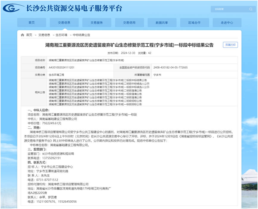 新年开新局,实干绘新篇。据长沙公共资源交易服务平台公示显示,省资源所成功中标湖南湘江重要源流区历史遗留废弃矿山生态修复示范工程(宁乡市域)一标段,中标金额近800万元。资源所人以“开局就是决战、起步就要冲刺”的奋斗姿态加压奋进,抢抓开局。