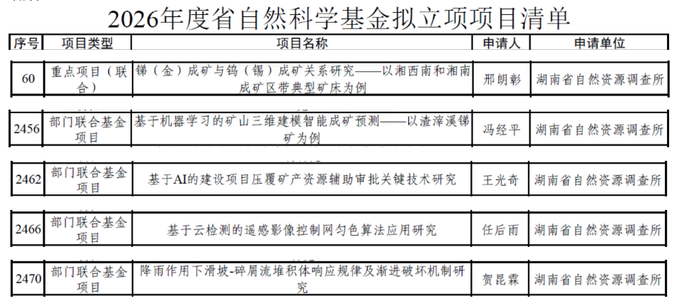 近日,2026年度湖南省自然科学基金拟立项项目名单完成公示,湖南地质资源所在本次申报上取得历史性突破,成功获批5个项目。 项目类型涵盖地质联合基金重点项目和自然资源联合基金项目,研究领域广泛,涉及成矿规律研究、三维智能成矿预测、AI辅助管理技术、云检测遥感应用、地质灾害成因机制等多个前沿方向。其中由资源所牵头申报的“锑(金)成矿与钨(锡)成矿关系研究——以湘西南和湘南成矿区带典型矿床”项目,成功获得地质联合基金重点项目立项,这标志着资源所实现了省自科基金重点项目上零的突破,具有重要的里程碑意义。